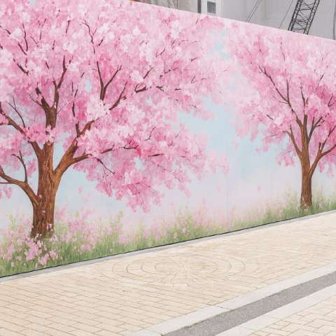 景観地区などでは、白く無機質な仮囲いが周囲の景観にそぐわないといった問題が発生することがあり、仮囲いに美しいアートや写真、草花や木々のデザインなどをラッピングすることで、周囲の景観となじませ調和させることが可能です。